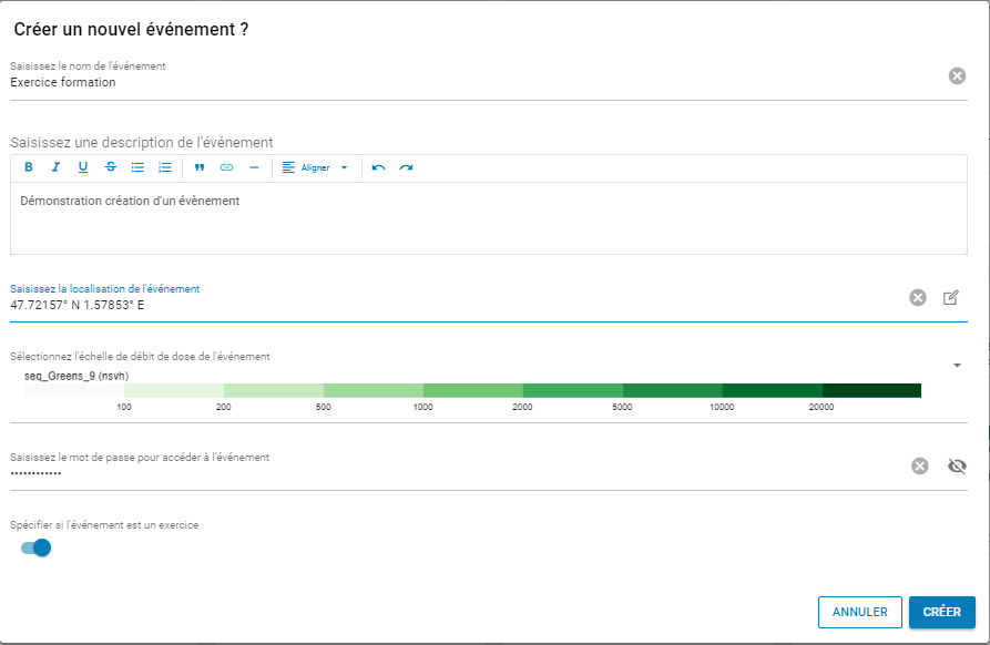 3) L'évènement est créé, par défaut, dans le cadre d'un exercice. Dans le cas d'une crise réelle, le switch doit être basculé.
