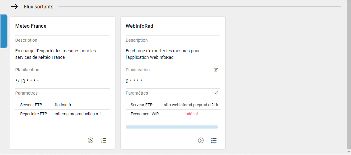flux Météo France : Le processus extrait les mesures de débit de dose et les met à disposition sur un dépôt FTP pour Météo France. Les paquets de données, dans un format csv, sont déposés chaque 10 minutes. Ce flux n'est pas configurable.