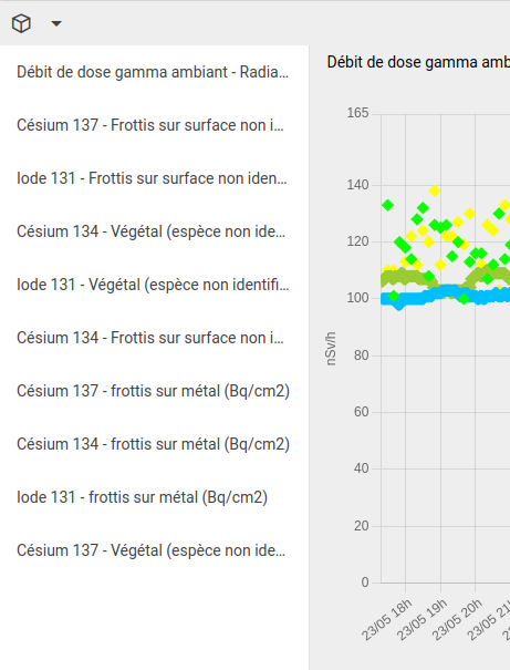 La vue graphique concentre tous les graphes temporels associés aux mesures sur le ou les points de prélèvements sélectionnés et la profondeur temporelle choisie. Les graphes sont regroupés par tuple {type de mesures-nature-unité} unique. En d'autres termes, un graphe représente l'évolution temporelle d'une valeur sur un ou plusieurs points de prélèvement pour un même type de mesures, une même nature et une même unité.