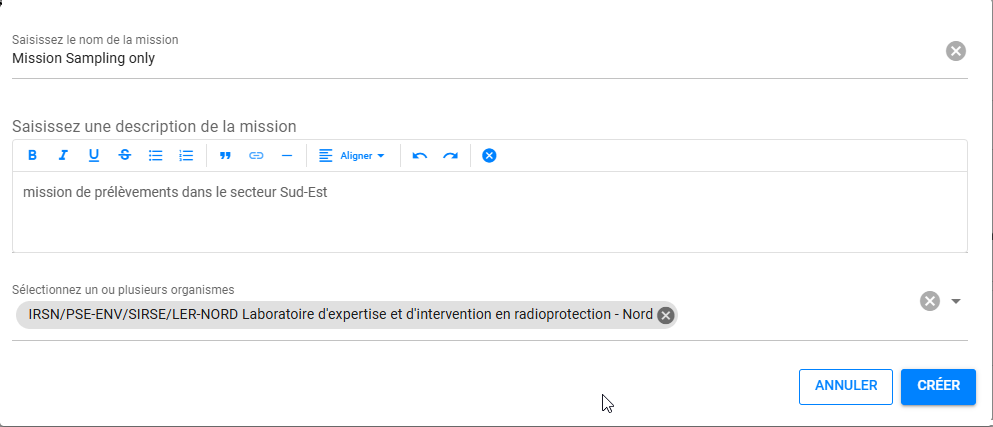 A la création d'une mission, un formulaire apparait et permet de définir son nom, sa description et les organismes qui y sont associés.